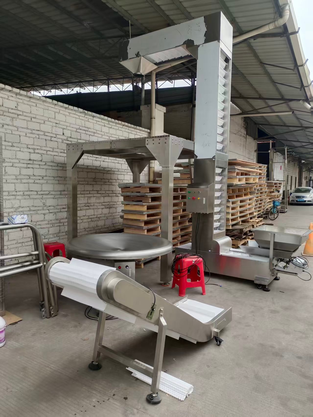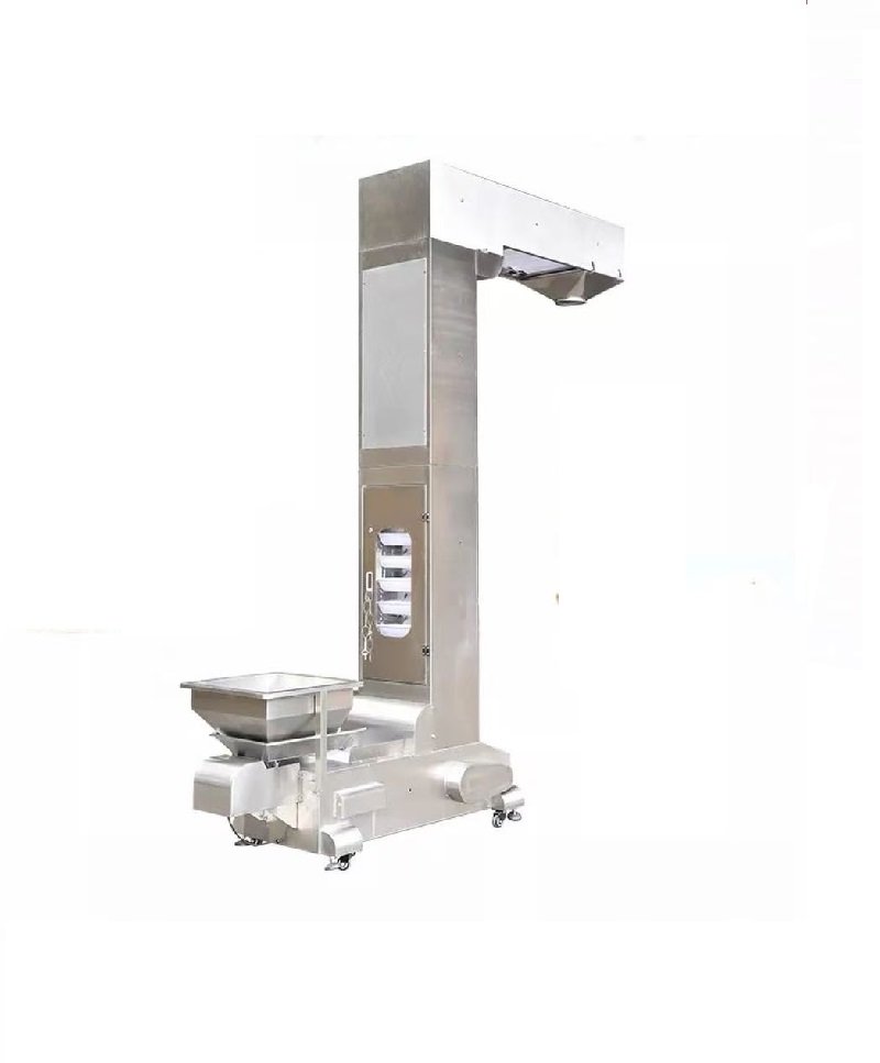 z shape vertical lift up the products to the multihead weigher, its size and vibration feeder hopper volume can be customized.
